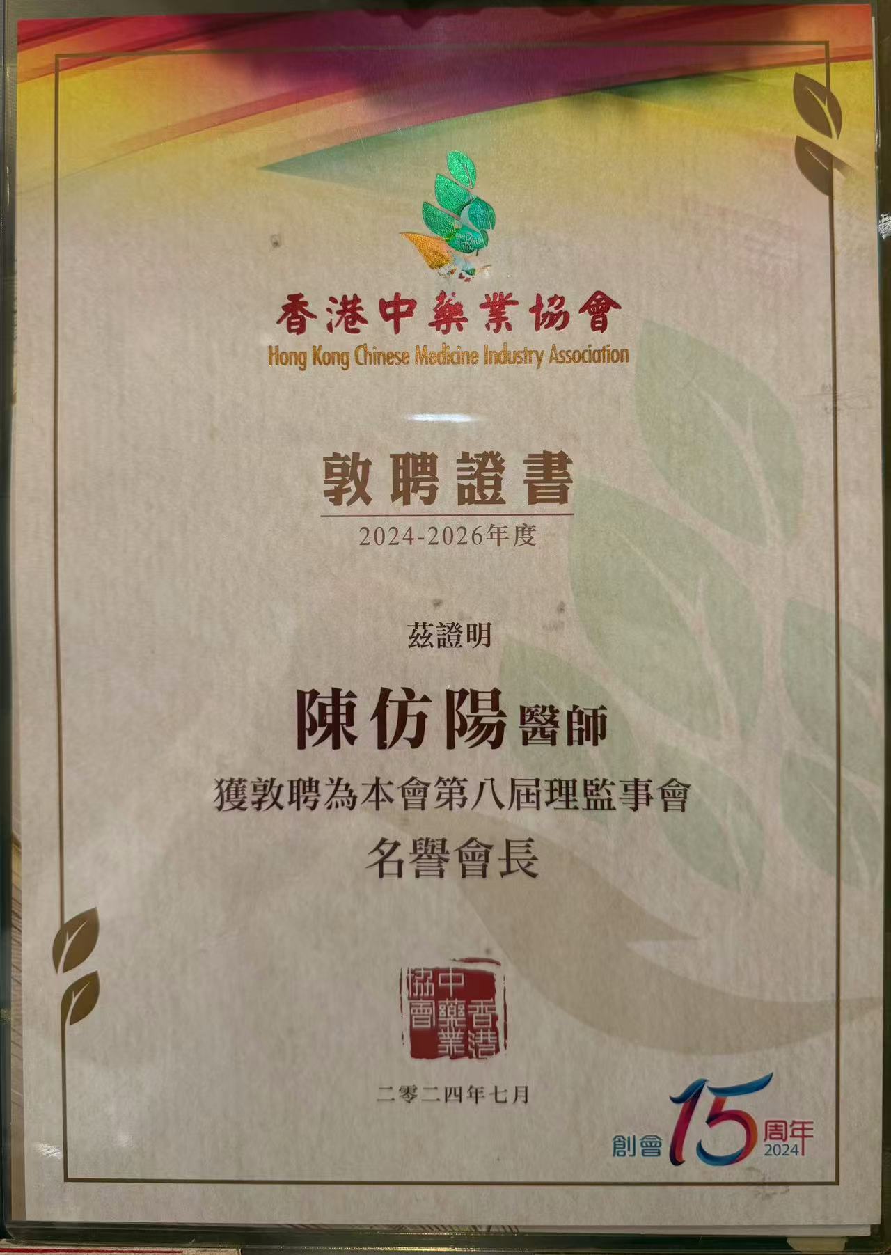 陈医师从事中医临床第一线工作30多年,现任香港益寿堂医药集团中医诊所及中山陈仿阳中医诊所驻诊中医专家。中港两地诊所,无论中医针灸、骨伤及疑难杂症均有署名的专家教授驻诊,为中港两地市民带来健康。同时担任香港明日灵芝药业有限公司董事长,在香港推广上市公司中国中药旗下天江药业的中药配方颗粒运用,令更多香港中医及市民认识优质科学浓缩配方中药颗粒。中港两地诊所均采用科学浓缩中药配方颗粒为患者治病,运用高效智能中药配制方便快捷,携带方便,即冲即饮,安全高效,深受两地市民信赖。