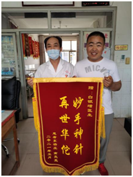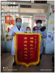 典型病历一:高某,女,38岁,多年神经性头痛,发作时痛不欲生,囟针囟骨治疗半分钟痛止,三次治疗至今未犯。图片为患者的感激照片。