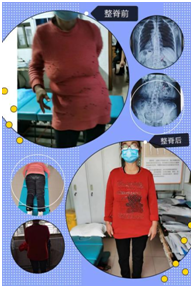 典型病历三:王某,女,57岁,脊柱严重侧弯,腰疼不能直立,每天还腹胀烧心。整脊治疗一次见效,立马不腰疼了。三次治疗基本自理了,烧心消失了。图片为前后对比照片。